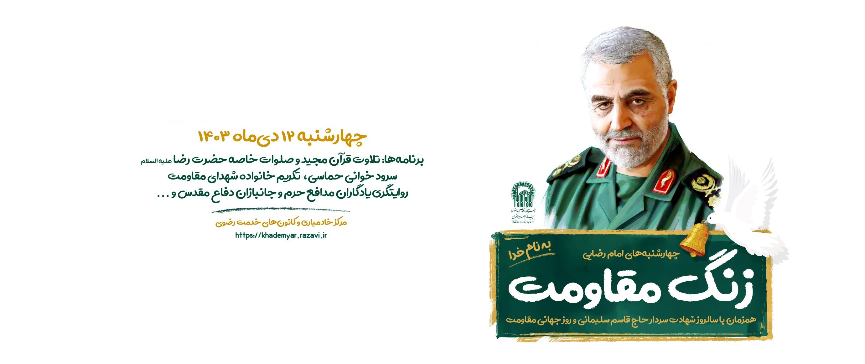 بر اين اساس خادمياران محترم در روز 4 شنبه مورخه 12 ديماه 1403كه چهارشنبه امام رضايي قبل از سالروز شهادت حاج قاسم ميباشد، ضمن حضور در مدارس و با هماهنگي قبلي مسئولان مربوطه و اطلاع رساني در شبكههاي مجازي و سايت و گروهها و چاپ بنر و پوستر به اجراي مراسم و ايجاد حال و هواي امام رضايي خواهند پرداخت.